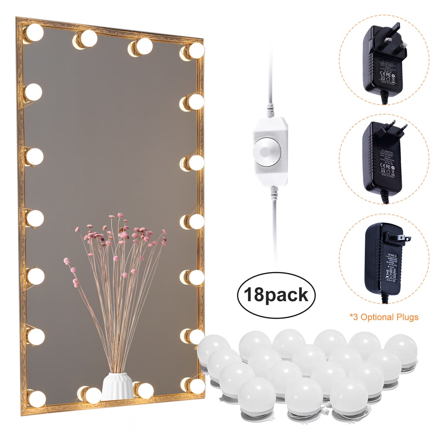 Die 18 LED-Kosmetikleuchten sind so konzipiert, dass sie miteinander verbunden werden können. Wenn eine der Glühbirnen defekt ist, können Sie sie ganz einfach austauschen. Sie können sogar so viele Kosmetikleuchten verwenden, wie Sie möchten, von 1 bis 18 oder mehr, damit sie in Spiegel jeder Größe passen. Wenn Sie mehr Kosmetikleuchten miteinander verbinden möchten, fügen Sie bitte leistungsstärkere Adapter hinzu, da jede LED-Spiegellampe etwa 1,5 W hat.