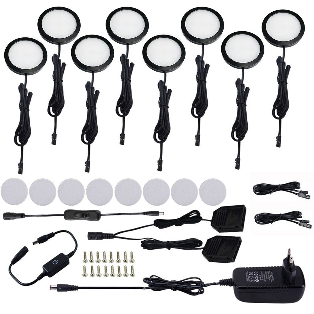 Schwarze LED-Unterschranklampe, rund, 12 Thekenleuchten, Beleuchtungsset, Touch-Dimmerschalter für Schrank, Küche