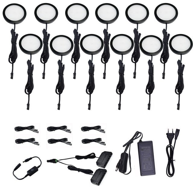 Black Led Under Cabinet Lamp round 12 counter Lights Lighting Kit touch dimmer switch for cupboard Kitchen