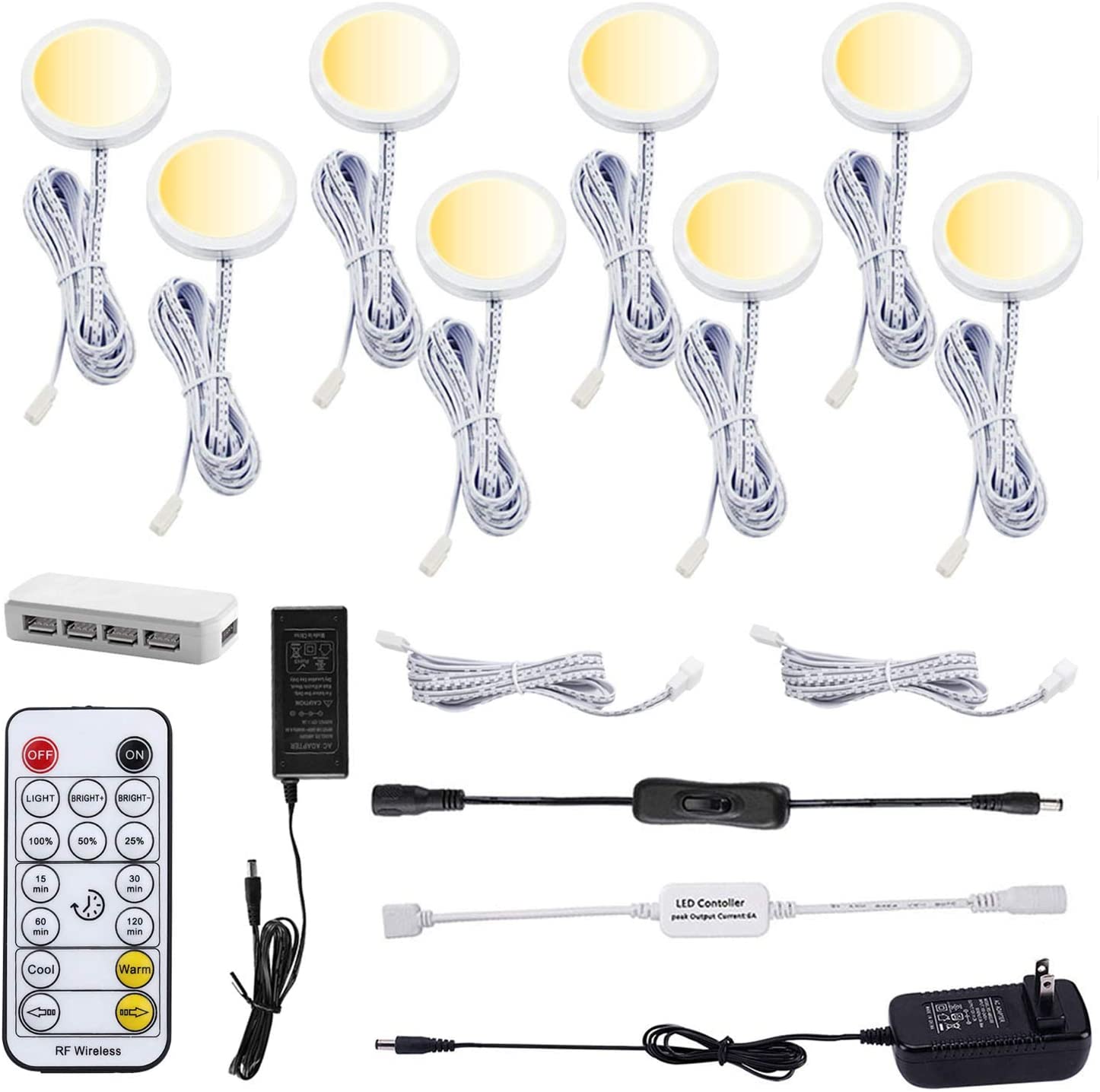 Color temperature adjustable puck lights. the main color is 2700k, 4000k,6000k.The user can define warm white or day white, or the mix of warm and cold white, or any color temperature between 2700K to 6000K to use, by using a rf remote controller. the puck lights temperature could be adjust smoothly from 2700k --6000k.you could Easily pick colors for different occasions with the light controller.